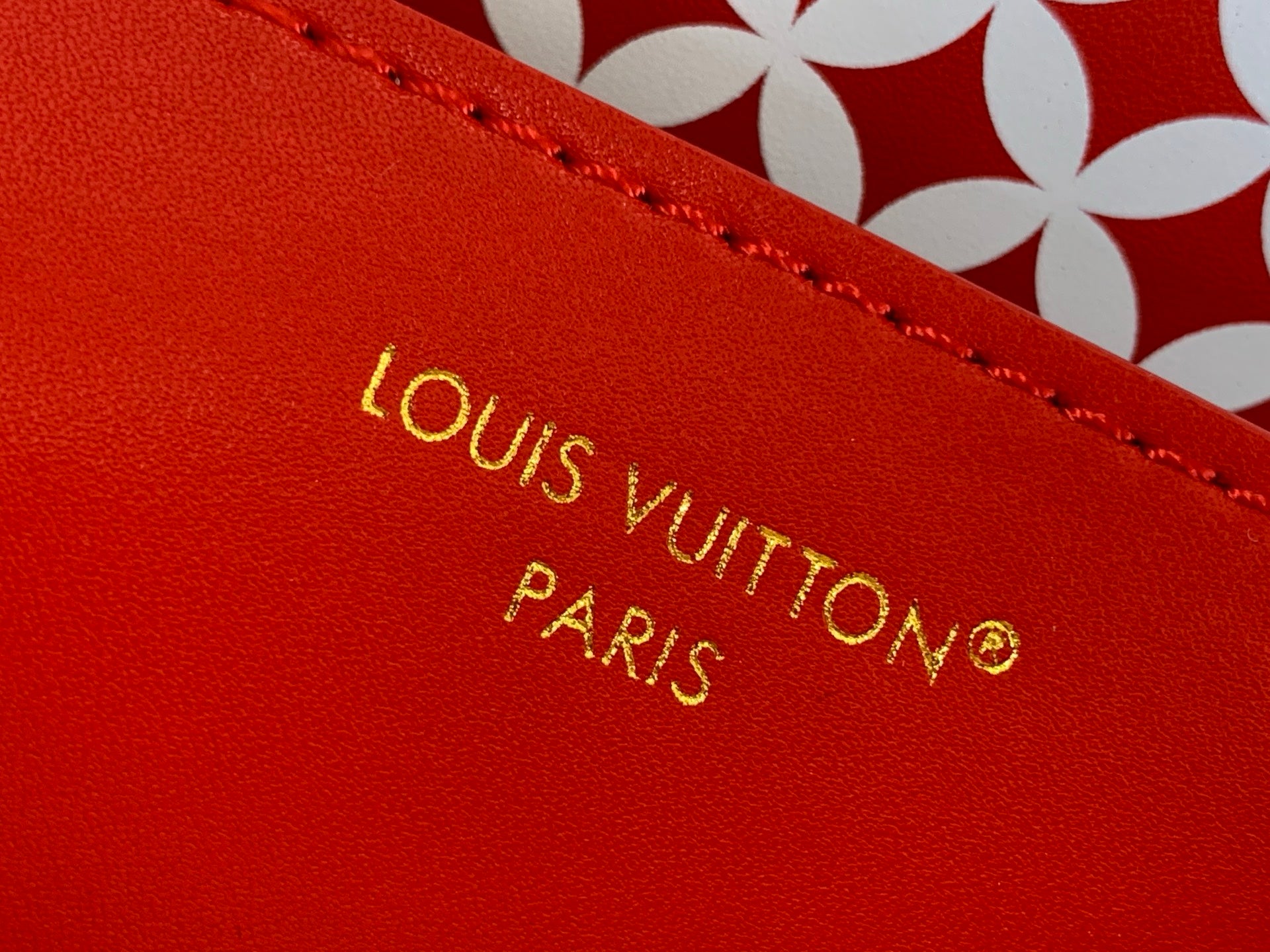 • The 'Sawagani' Pouch: The signature, removable heart-shaped pouch is meticulously replicated in red and black leather with a white LV logo, attached with the correct gold-toned chain and D-ring.