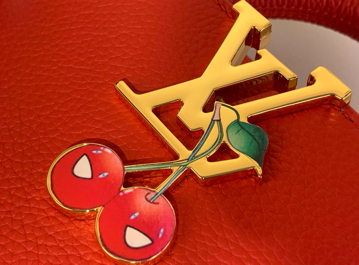 This is the highly coveted Louis Vuitton x Takashi Murakami Capucines BB, featured in the striking red Taurillon leather and playfully embellished with the cheerful cherry motif. This masterpiece is part of the spirited second edition of the LV x Murakami collection, blending the timeless elegance of the Capucines line with the vibrant, sought-after pop sensibility of the Japanese artist.