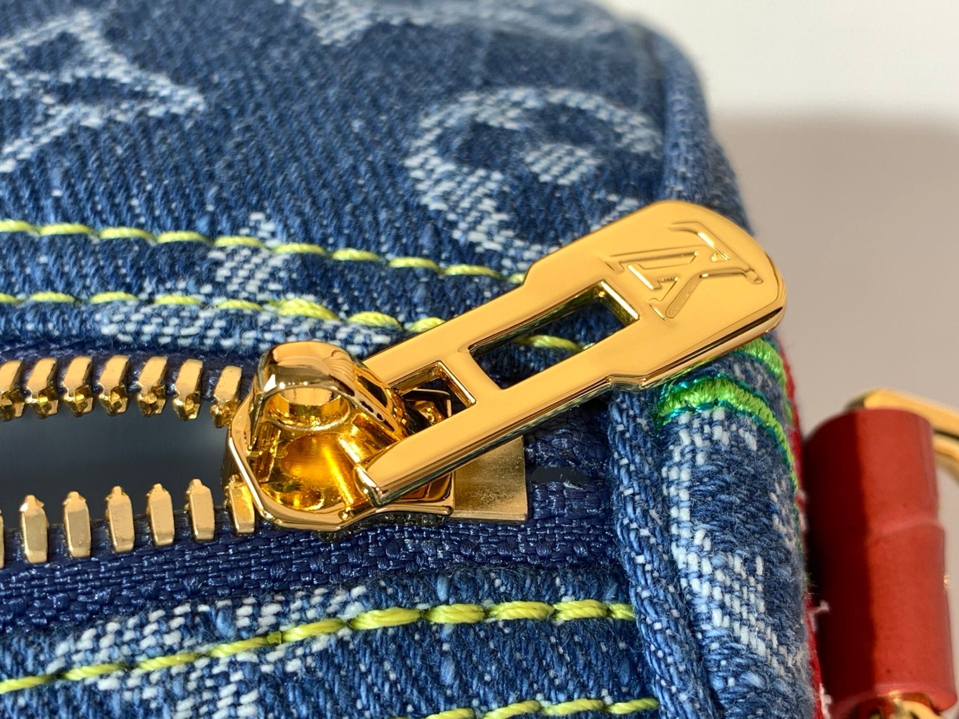 The body is constructed from a premium-grade, heavy stonewashed indigo denim, perfectly replicating the soft yet substantial feel of the original. The iconic Louis Vuitton Monogram is expertly jacquard-woven into the denim, providing a subtly textured and authentic base.